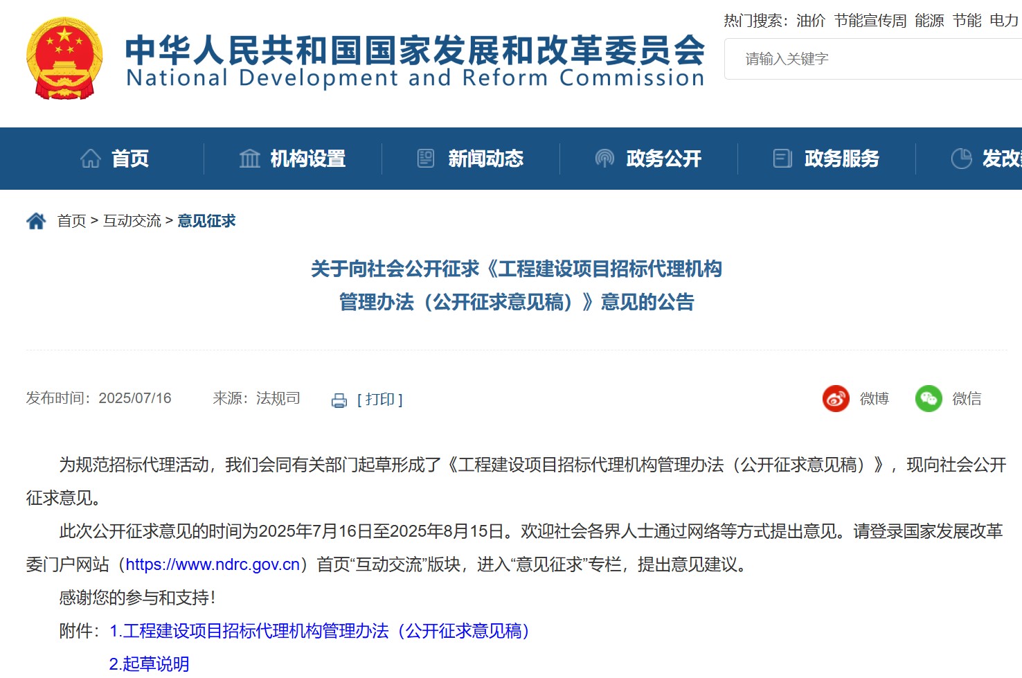 國家發(fā)展和改革委員會(huì)向社會(huì)公開征求《工程建設(shè)項(xiàng)目招標(biāo)代理機(jī)構(gòu)管理辦法(公開征求意見稿)》意見